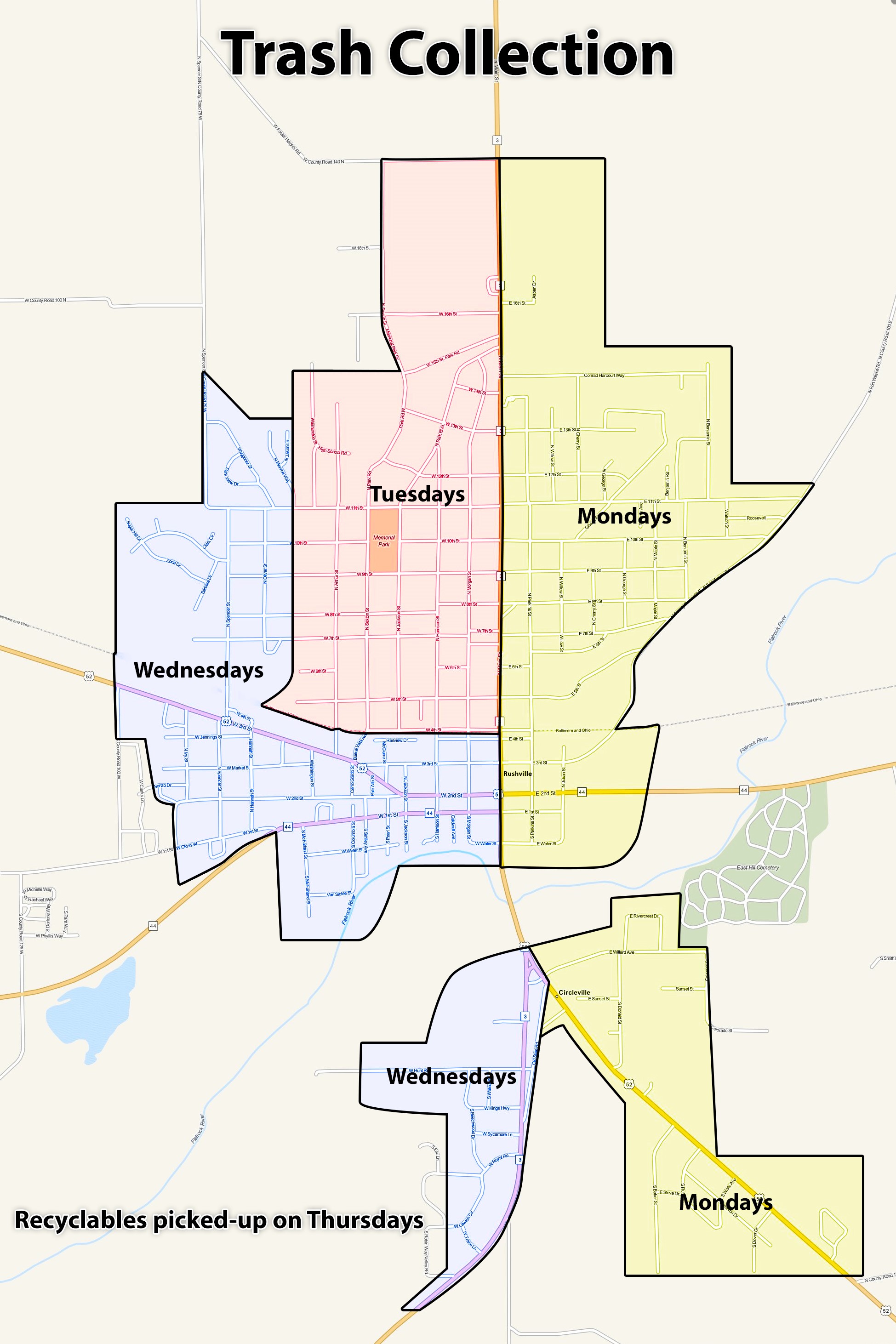 The City of Rushville runs three garbage routes Monday through Wednesday with weekly curbside trash collection according to the following schedule: